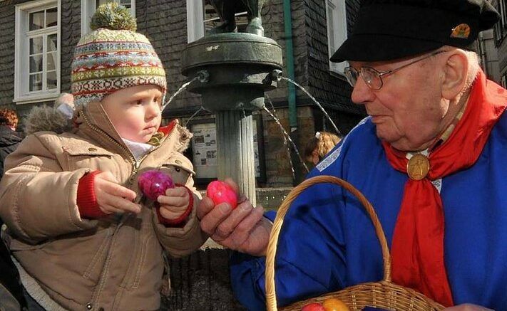 Ein Osterbrauchtum der Aule Mettmanner seit 1952 am Pferdebrunnen vor dem Stadtgeschichtshaus.