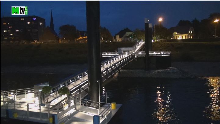 Monheim am Rhein. Der Monheimer Schiffsanleger ist eingeweiht. Am Donnerstag, den 28.09.2017 durchschnitten Landrat Thomas Hendele und Bürgermeister Daniel Zimmermann gemeinsam das Band zur Freigabe der imposanten Landebrücke, die nun 70 Meter in den Rhein hineinragt.