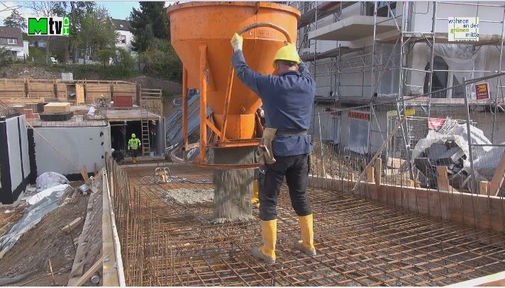 1. Vorvereitungen zum Giesen der Decke über dem Kellergeschoß. Die Tiefgarageneinfahrt wird mit Beton verfüllt.