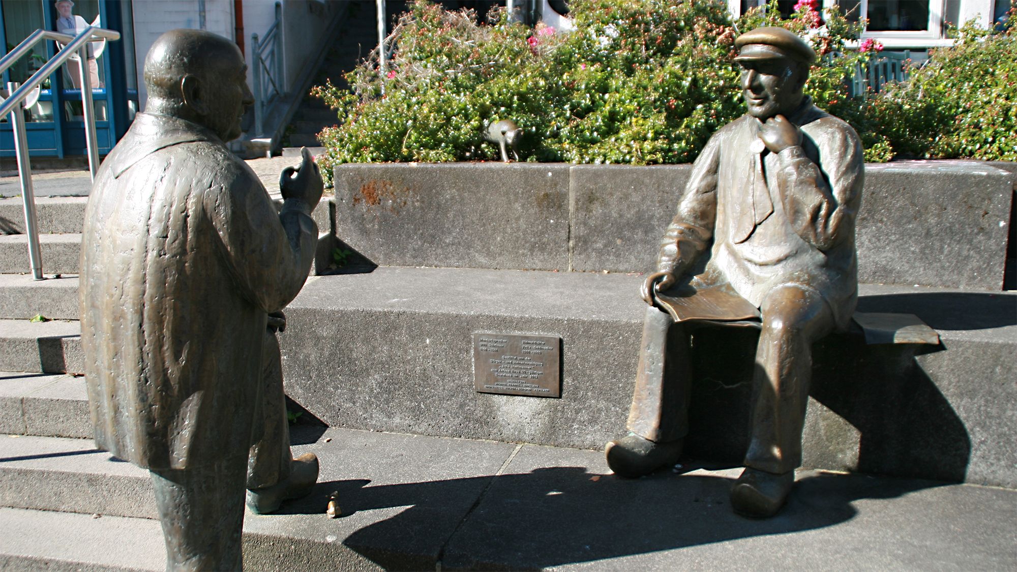 Zum 1100-jährigen Jubiläum der Kreisstadt Mettmann stiftete der Bürger- und Heimatverein Aule Mettmanner die vom Bildhauer Michael Franke entworfende Bronzestatuen von Fritz Geldmacher und Willi Schriever.